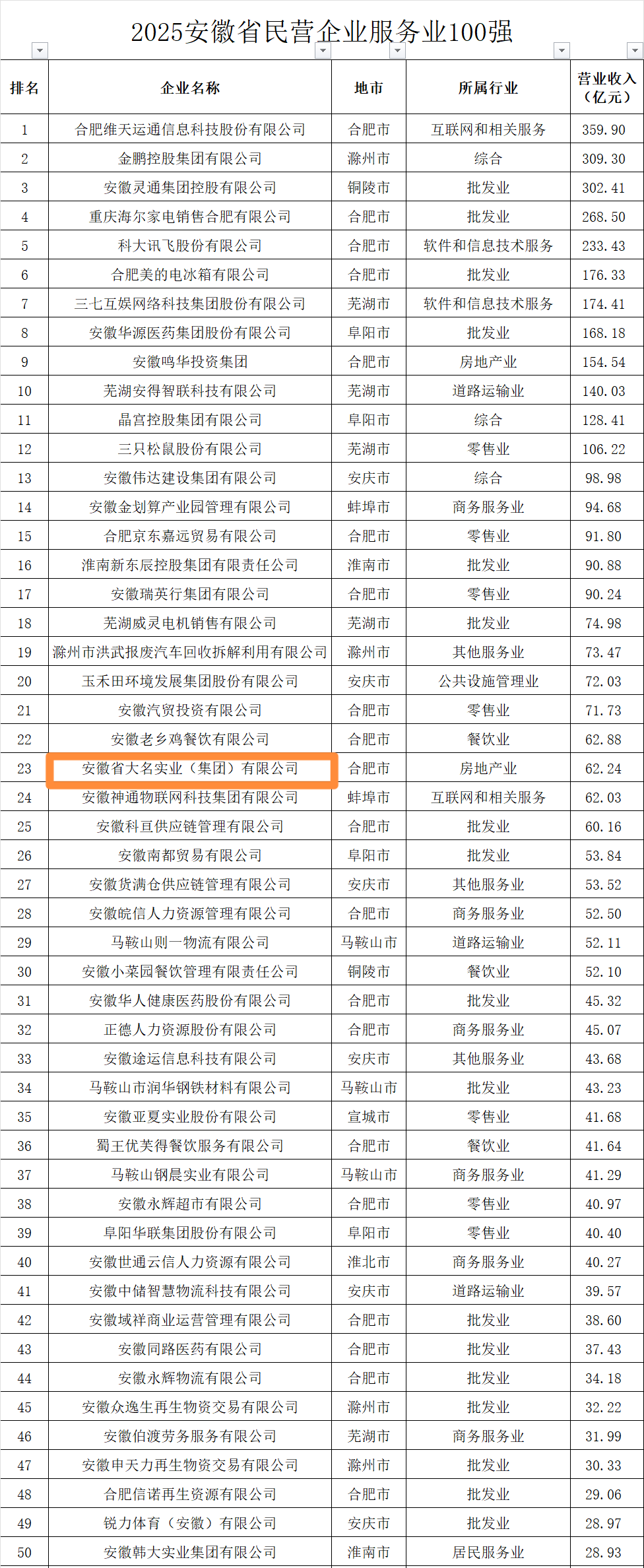 10月16日上午,2025安徽省民營企業百強發布會在合肥舉辦。會上,發布了2025安徽省民營企業營收百強榜單、2025安徽省民營企業制造業百強榜單、2025安徽省民營企業服務業百強榜單、2025安徽省民營企業吸納就業百強名單及《2025安徽省民營企業百強分析報告》。 安徽省大名實業(集團)有限公司榮獲2025安徽省民營企業營收百強榜!榮獲2025安徽省民營企業服務業23強稱號,相比去年排名提升7位!