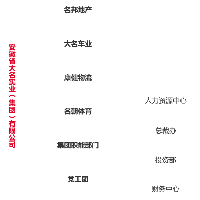 安徽省大名實業(集團)有限公司,其前身是經安徽省體改委批準設立的全省100家股份制試點企業之一,是集品牌代理、連鎖服務、房產投資開發、資本運營及多元化發展為一體的民營股份制投資管理型企業。集團目前主要有四大產業:大名車業主要經營代理品牌汽車及新能源車;名邦地產以房地產開發為業務發展主線,覆蓋營銷代理、物業管理、商業運營、商住智能化及景觀綠化施工等產業;物流集貨物運輸、倉儲、配送、流通加工、包裝為一體,依托完善的運輸網絡優勢,力求提高客戶供應鏈系統效率;名朝體育匯集了優秀的教練員、運動員、裁判員以及教務團隊、銷售團隊,目前有七家校區和一家籃球公園,未來將有更多的校區陸續開放中。