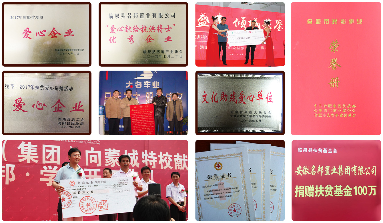 · 1998年,公司組織捐款賑濟江淮特大水災災區; · 1999年6月28日,捐助3.2萬元,資助金寨縣80名失學女童重返校園; · 2000年1月11日,實地探望長豐縣夏店鄉受害致貧小木匠陸中明的家人,并資 助其子女從小學到大學的全部費用; · 2001年7月4日,大名車業開展慰問合肥交警服務活動; · 2002年至2006年,先后在省內貧困地區投資興建了大名新河希望小學(肥西縣高店鄉)、金寨縣力帆光彩小學、肥西縣山南力帆光彩小學、肥西縣夏寨光彩小學、桐城光彩小學等多所希望小學; · 2005年,向安徽教育學院生物系捐助五萬元用于建立細胞分子生物學實驗室,該實驗室冠名“大名實驗室”; · 2006年,在合肥師范學院設立獎學金,并成立實習基地; · 2008年,四川汶川地震,除了對汶川大地震遇難同胞的深切哀悼,大名人還自發向災區捐款27萬元人民幣; · 2010年,青海玉樹地震,大名捐款10萬元人民幣; · 2011年,向蒙城特教學校捐助20萬元人民幣; · 2011年12月,向希望工程安徽省青少年發展基金會捐贈2萬元,被授予“愛心慈善單位”稱號; · 2013年,向殘疾人捐助近萬元的雜志書刊,被授予“文化助殘愛心單位”獎牌; · 2016年7月,肥西縣三河、豐樂、嚴店等鄉鎮遭受的特大洪災,名邦地產全員開展愛心募捐活動,捐款數額達數萬元; · 2017年1月,臨泉名邦國際花都向臨泉縣殘疾人聯合會捐款捐物; · 2017年,名邦地產各項目多次向當地數百多位環衛工人贈送物資和愛心慰問品; · 2017年,名邦地產向渦陽一中捐贈28萬元公益教育基金; · 2017年,名邦地產向固鎮特殊教育學校捐贈10萬元公益基金; · 2018年8月,康健物流參加肥西縣“百企幫百村”精準扶貧慈善活動,捐款1萬元; · 2018年5月,蒙城名邦置業捐贈愛心公益基金,助力藍天救援隊; · 2018年10月,名邦地產向臨泉縣扶貧基金會捐贈扶貧基金100萬元; · 2019年3月,渦陽名邦錦繡年華參與雷鋒月扶貧公益,捐贈相關物資; · 2019年5月,對口捐助岳西青天鄉中心學校近萬元; · 2019年9月,渦陽縣開展“愛心成長圓夢 助理脫貧攻堅”活動,捐贈5萬元作為愛心扶貧捐款; · 2020年1月20日,臨泉縣名創向邢塘街道捐贈扶貧款; · 2020年6月22日,渦陽名邦地產參加并支持“百企幫百村”扶貧慰問公益活動; · 2020年9月18日,六安名邦地產扶貧慰問趙寨村、倪店村,助力脫貧攻堅; · 2020年,大名集團黨支部捐款近萬元,支持社區的新冠肺炎疫情防控工作; · 2021年1月,渦陽名邦地產資助渦陽縣貧困大學生并看望慰問獨居老人; · 2021年5月,渦陽名邦給陽光醫院、交警、環衛等基層社會服務人員提供200份愛心早餐; · 2021年,名邦地產多次扶貧濟困捐款捐物數萬元; · 2022年,阜南名邦地產多次捐款捐物,包括校服、米面、防疫帳篷等近10萬元; · 2022年,蒙城名邦地產多次向社區捐贈飲料食品、口罩酒精等; · 2022年,渦陽名邦、霍邱名邦地產多次向防疫辦及相關抗疫工作人員捐贈物資; · 2022年,臨泉名邦地產以實際行動扶貧獻愛心。 · 2022年,六安名邦地產捐款近萬元支持鄉村振興行動。 · 2022年6月,名邦地產探望慰問合肥市社會福利院兒童。 · 2022年6月,名邦地產各項目在各高考考點搭建安心服務點為家長和考生送去礦泉水等降暑物資,用實際行動為考生加油鼓勁。